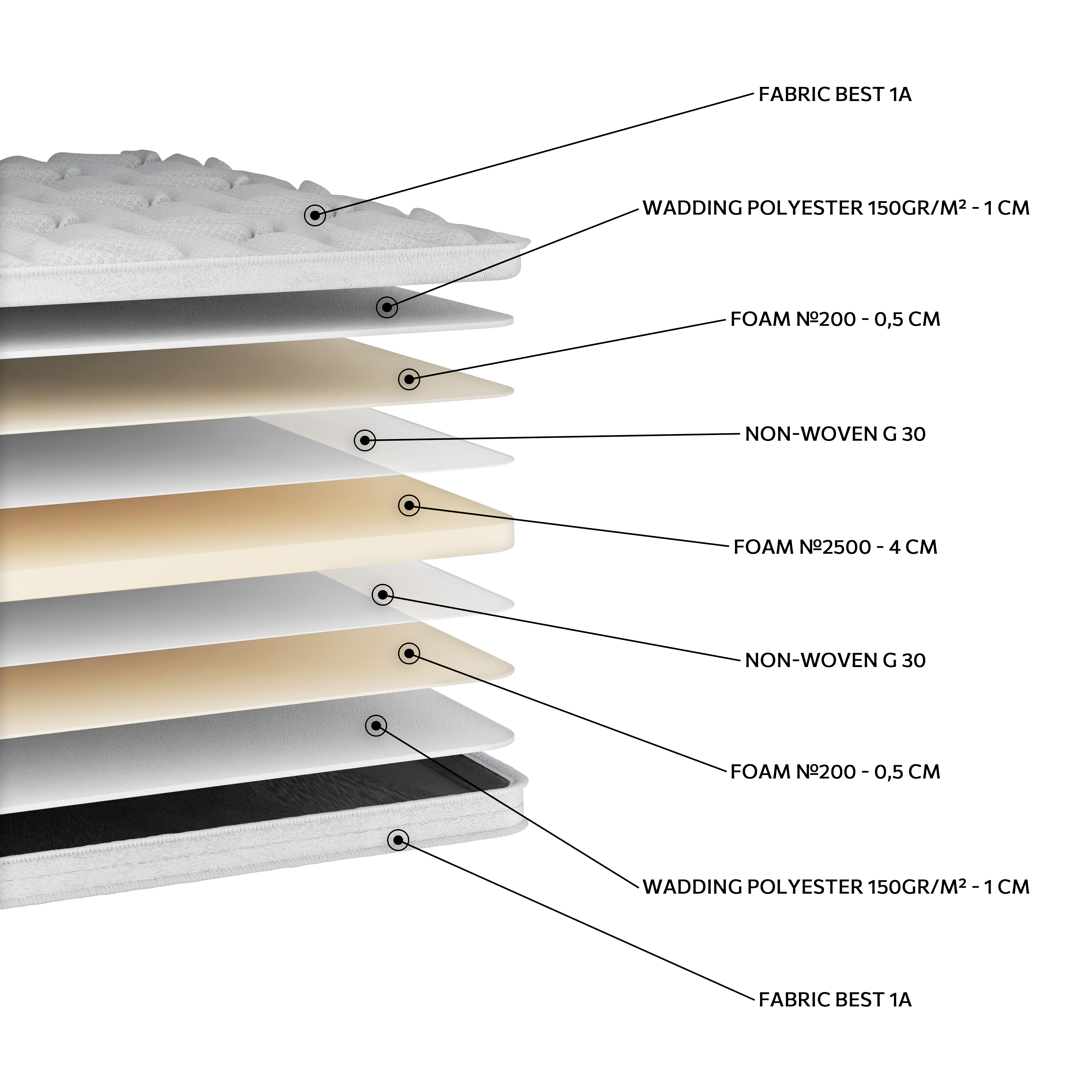 Ανώστρωμα που προσφέρει σταθερή στήριξη και άνεση, ιδανικό για να βελτιώσει την αίσθηση του στρώματος. Οι στρώσεις αφρού προσφέρουν εργονομία και ανακουφίζουν το σώμα, ενώ το ύφασμα Best 1A εξασφαλίζει ευχάριστη υφή και σωστό αερισμό.