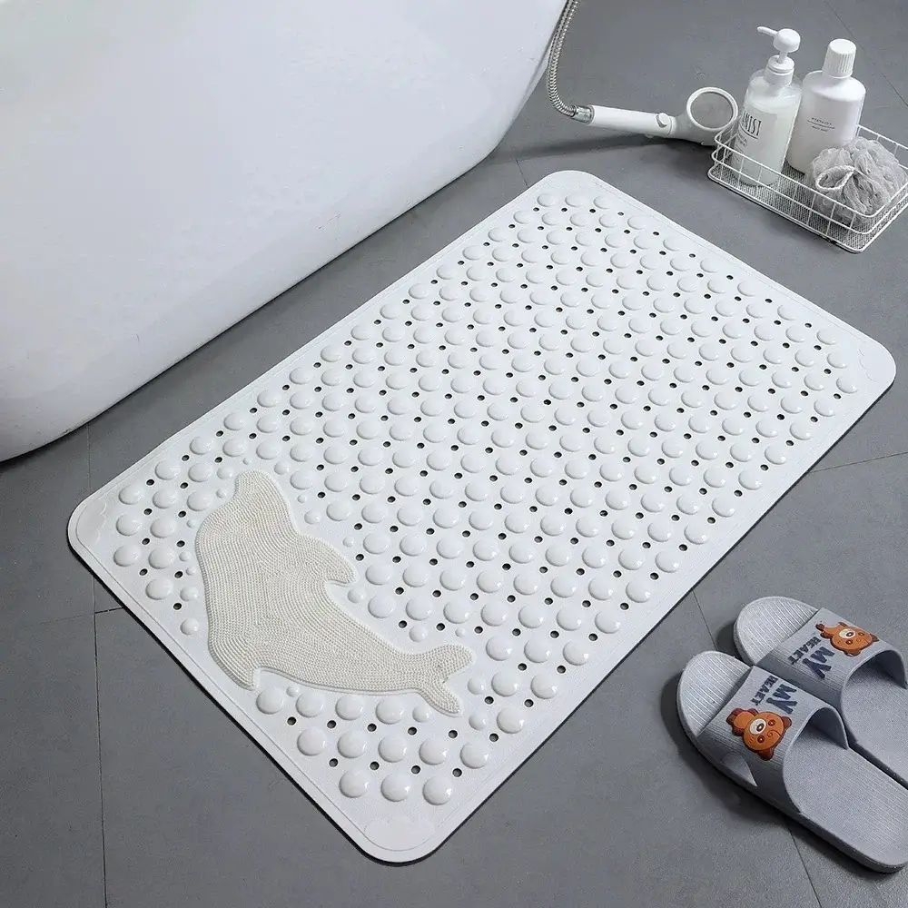 Τοποθετήστε το αντιολισθητικό πατάκι μπάνιου 45×75 HT-4 στο ντους ή δίπλα στην μπανιέρα. Το πατάκι σταθεροποιεί τα βήματά σας με την ανάγλυφη επιφάνεια και τις φυσαλίδες που προσφέρουν άνετο πάτημα. Χρησιμοποιήστε το ειδικό σχέδιο δελφινιού για να τρίψετε απαλά τα πέλματα ή για απολέπιση νεκρών κυττάρων. Το πατάκι προσφέρει μεγαλύτερη ασφάλεια σε σπίτια με παιδιά, ηλικιωμένους ή σε χώρους όπου χρειάζεται σταθερότητα. Καθαρίστε το εύκολα με νερό και ήπιο σαπούνι και αφήστε το να στεγνώσει φυσικά πριν το επόμενο ντους.