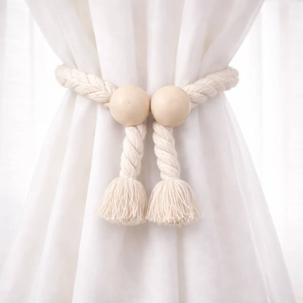 Η δέστρα κουρτίνας YXMQ-3 προσφέρει εύκολη συγκράτηση της κουρτίνας με πρακτικό μαγνητικό κλείσιμο. Το πλεκτό κορδόνι σε συνδυασμό με τη ξύλινη μπίλια δημιουργεί ένα ισορροπημένο και προσεγμένο αποτέλεσμα στον χώρο. Κατάλληλη για χρήση σε διαφορετικούς τύπους κουρτίνας. Οι διακοσμητικές φούντες προσθέτουν μια διακριτική λεπτομέρεια που ταιριάζει σε καθημερινή χρήση. Αποτελεί μια απλή και λειτουργική επιλογή για το σαλόνι, το υπνοδωμάτιο ή επαγγελματικούς χώρους.