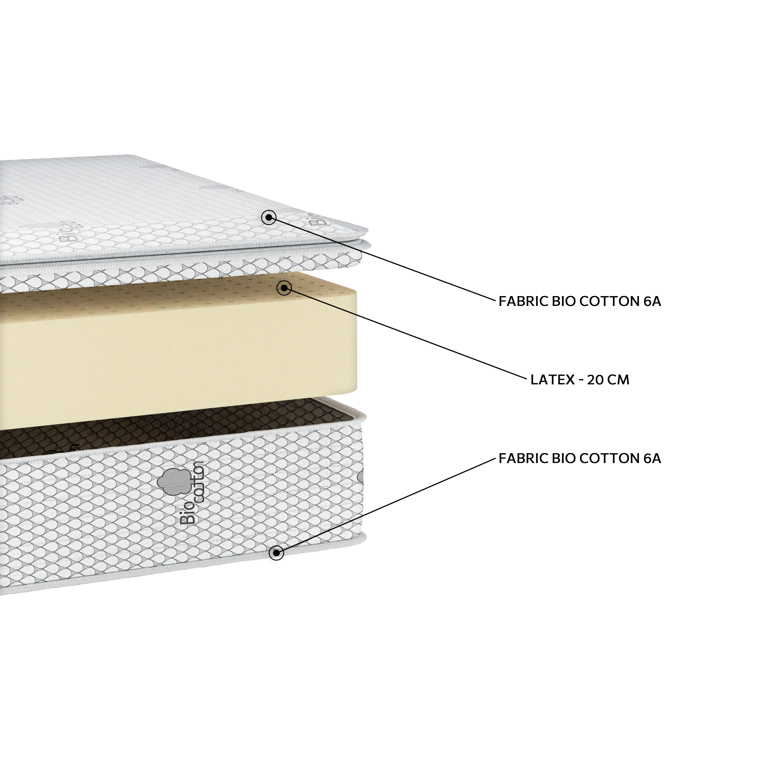 Στρώμα εξ ολοκλήρου από Latex με μέτρια προς μαλακή σκληρότητα, που προσαρμόζεται φυσικά στο σώμα και προσφέρει εξαιρετική άνεση και στήριξη. Χάρη στη δομή του, επιτρέπει τον σωστό αερισμό και διατηρεί ιδανικές συνθήκες ύπνου. Το ύφασμα Bio Cotton 6A προσφέρει φυσική αίσθηση και ενισχύει την υγιεινή του στρώματος.