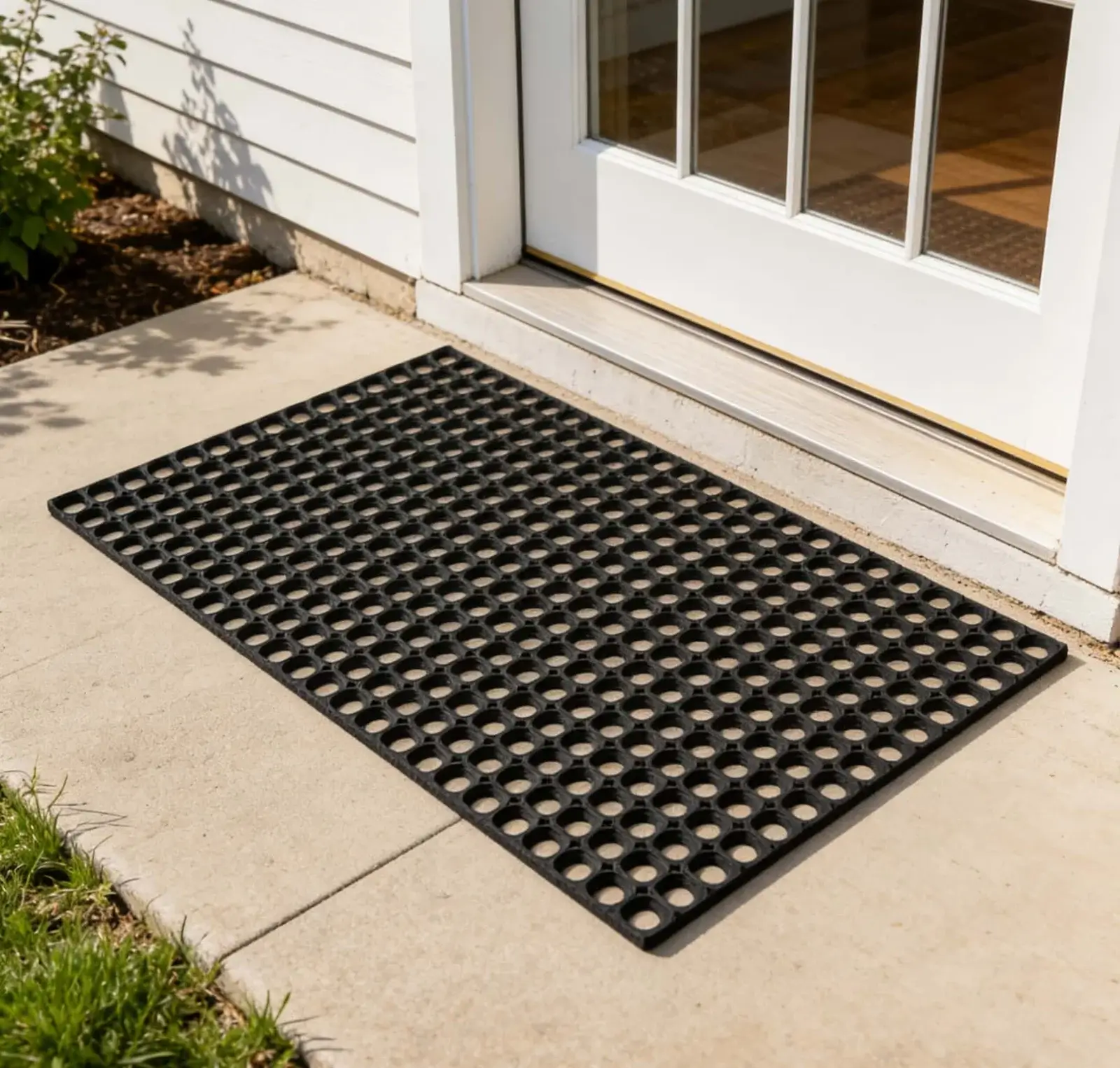 Τοποθετήστε το λαστιχένιο πατάκι εισόδου 60x90cm στην εξώπορτα, το μπαλκόνι ή την αυλή σας. Η διάτρητη επιφάνεια παγιδεύει χώμα και λάσπη, ενώ αποστραγγίζει το νερό ώστε να μην λιμνάζει. Χρησιμοποιήστε το για να διατηρείτε σταθερό πάτημα σε βρεγμένα δάπεδα και προστατέψτε το εσωτερικό σας από βρωμιά. Τινάξτε ή ξεπλύνετε το πατάκι εύκολα και αφήστε το να στεγνώσει φυσικά. Ιδανικό για καθημερινή χρήση σε σπίτια, καταστήματα ή επαγγελματικούς χώρους με συχνή διέλευση.
