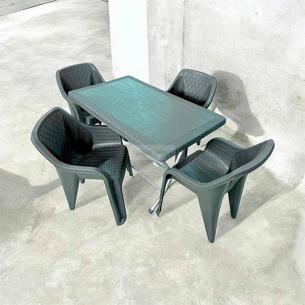 Το σετ περιλαμβάνει 4 καρέκλες και 1 τραπέζι με μεταλλική πτυσσόμενη βάση, που προσφέρει ευκολία στη μεταφορά και αποθήκευση. Ο εργονομικός σχεδιασμός των καρεκλών εξασφαλίζει άνετο κάθισμα, ενώ το υλικό αντέχει στον ήλιο και την υγρασία χωρίς να απαιτεί συντήρηση. Αποτελεί εξαιρετική επιλογή για βεράντες, αυλές και επαγγελματικούς χώρους.