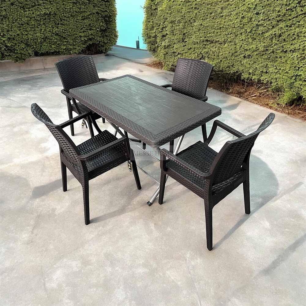 Οι καρέκλες διαθέτουν ενισχυμένο πολυπροπυλένιο με ματ υφή rattan, αντέχουν σε όλες τις καιρικές συνθήκες και παρέχουν άνετο κάθισμα. Το τραπέζι με μεταλλική πτυσσόμενη βάση διευκολύνει τη μεταφορά και την αποθήκευση, χωρίς να απαιτεί συντήρηση.