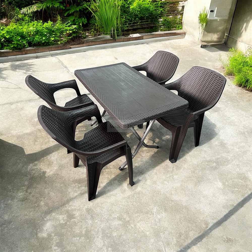 Το σετ τραπεζαρίας Terra Queen Rattan συνδυάζει άνεση και λειτουργικότητα για κάθε εξωτερικό χώρο. Το ανθεκτικό πολυπροπυλένιο με ματ υφή προσφέρει μεγάλη αντοχή στη χρήση και στις καιρικές συνθήκες. Το σετ περιλαμβάνει 4 άνετες καρέκλες και 1 τραπέζι με μεταλλική πτυσσόμενη βάση, ιδανικό για εύκολη αποθήκευση και μεταφορά.