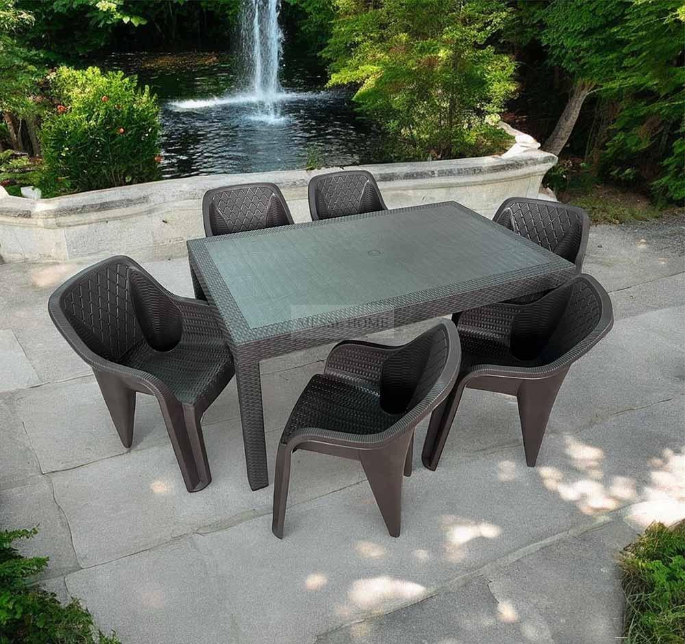 Η ματ υφή rattan χαρίζει μοντέρνα αισθητική και ταιριάζει εύκολα σε κήπους, βεράντες και επαγγελματικούς χώρους. Το σετ περιλαμβάνει έξι καρέκλες και ένα ευρύχωρο τραπέζι, ιδανικό για οικογένεια ή παρέες.