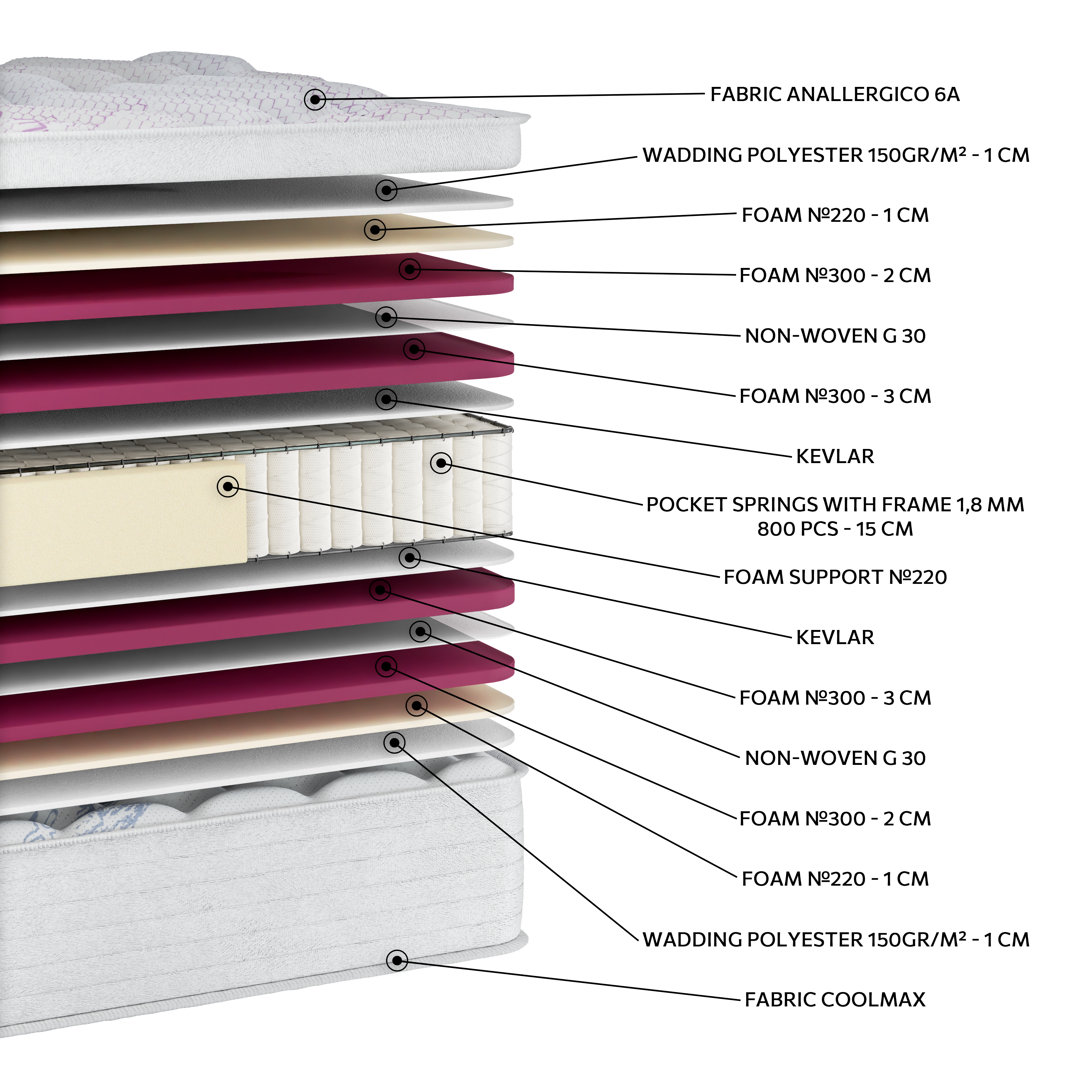 • Ύφασμα εξωτερικό: Αντιαλλεργικό (Anallergico 6A)