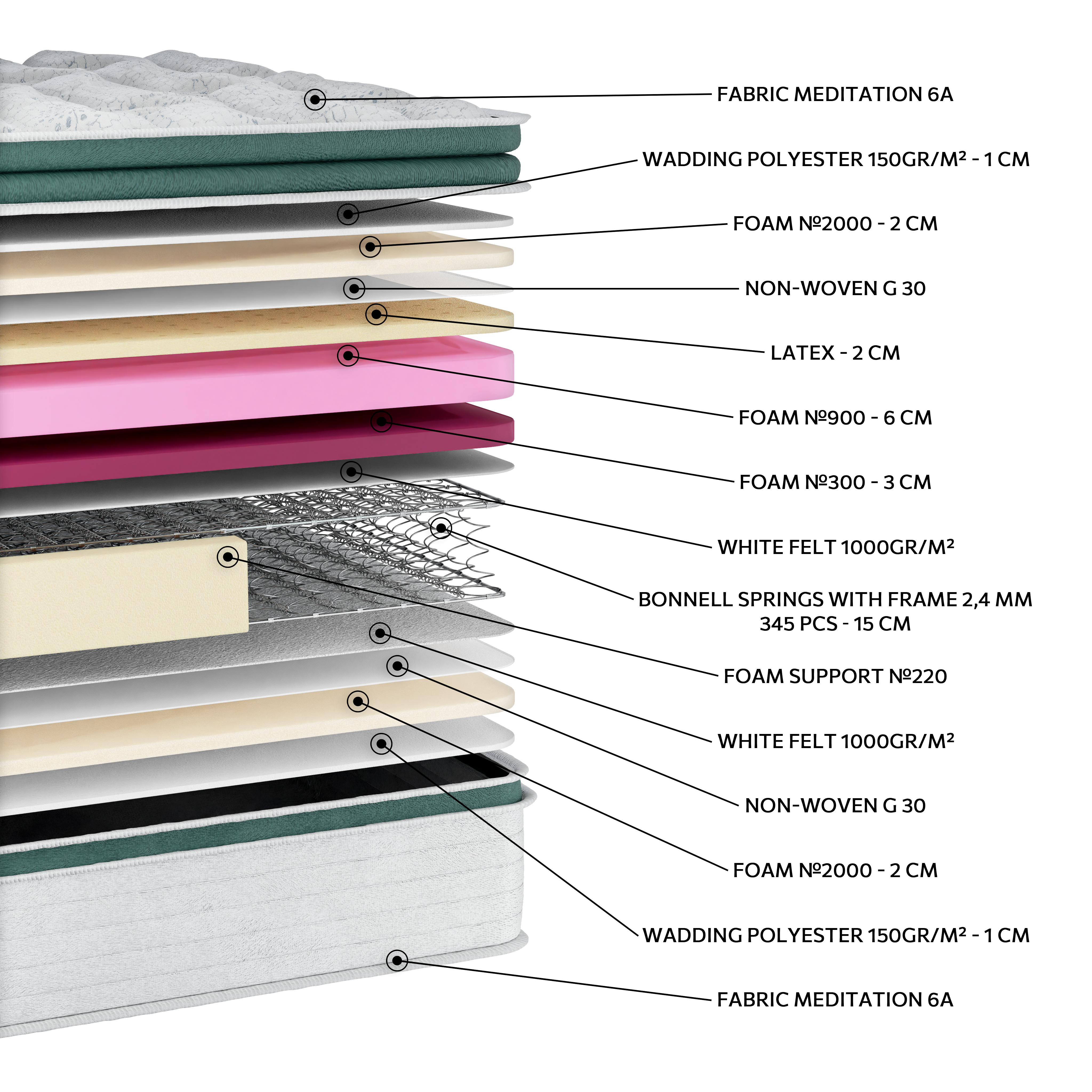 Στρώμα μέτριο προς μαλακό με Pillowtop και ενισχυμένη στήριξη, σχεδιασμένο για απαλή αίσθηση χωρίς να θυσιάζει τη σταθερότητα. Τα Bonnell Springs με λαμάκι προσφέρουν αυξημένη αντοχή και σωστή κατανομή του βάρους, ενώ οι στρώσεις Latex και αφρού υψηλής ποιότητας προσαρμόζονται αρμονικά στο σώμα, μειώνοντας τα σημεία πίεσης. Το Pillowtop ενισχύει την πολυτέλεια και την αίσθηση χαλάρωσης, ενώ το ύφασμα Meditation 6A διατηρεί ιδανικές συνθήκες αερισμού για υγιεινό ύπνο. Μια εξαιρετική επιλογή για όσους επιθυμούν άνεση με ενισχυμένη στήριξη και απαλότητα.