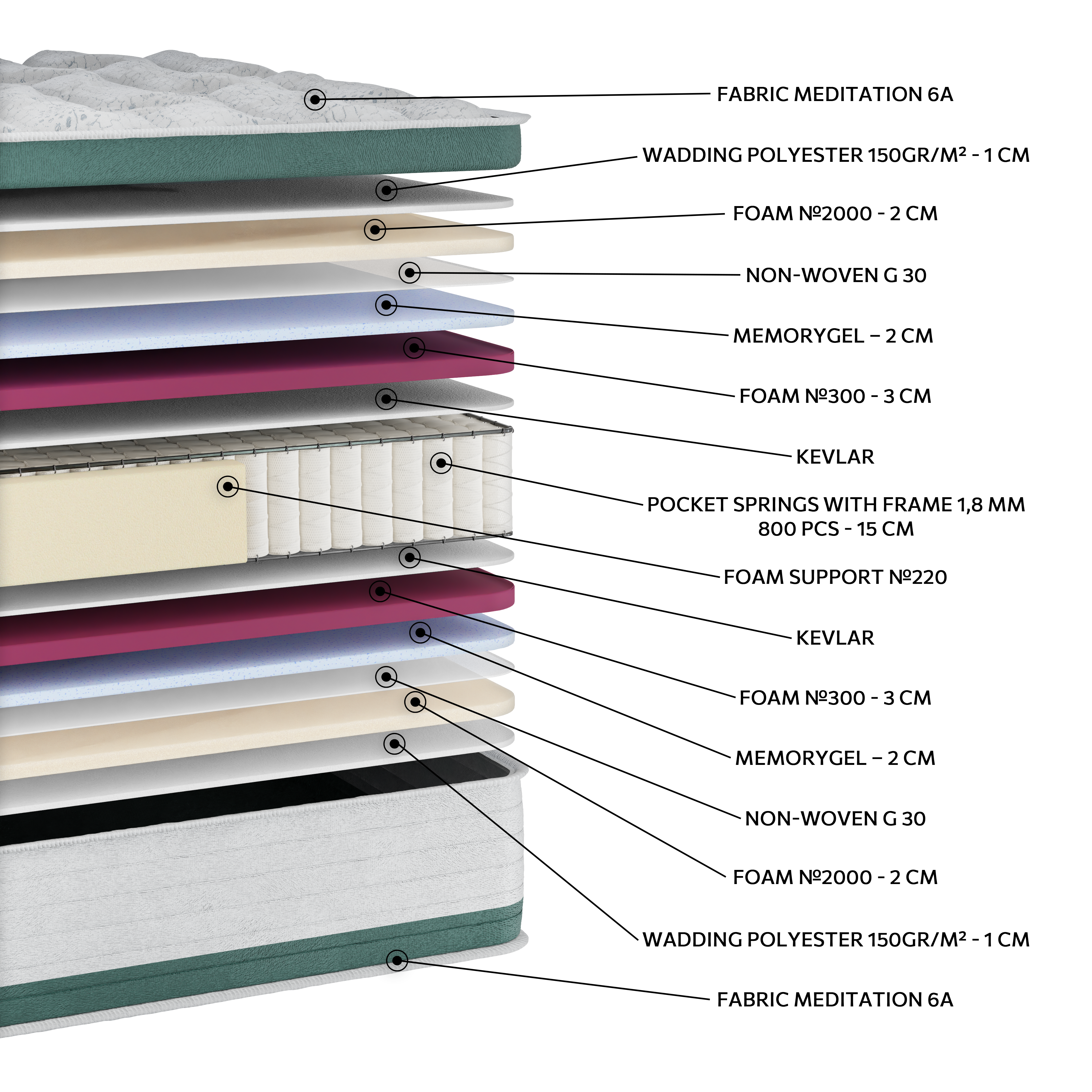 Στρώμα μέτριας προς μαλακής αίσθησης με ανεξάρτητα ελατήρια Pocket, που προσαρμόζονται στις κινήσεις του σώματος, εξασφαλίζοντας εξατομικευμένη στήριξη και άνεση. Οι στρώσεις MemoryGel και αφρού υψηλής ποιότητας μειώνουν τα σημεία πίεσης και αγκαλιάζουν το σώμα, χαρίζοντας αίσθηση χαλάρωσης. Το ύφασμα Meditation 6A προσφέρει απαλή υφή και συμβάλλει στη ρύθμιση της θερμοκρασίας. Μια εξαιρετική επιλογή για όσους αναζητούν έναν απολαυστικά αναπαυτικό ύπνο με αίσθηση δροσιάς και ευεξίας.