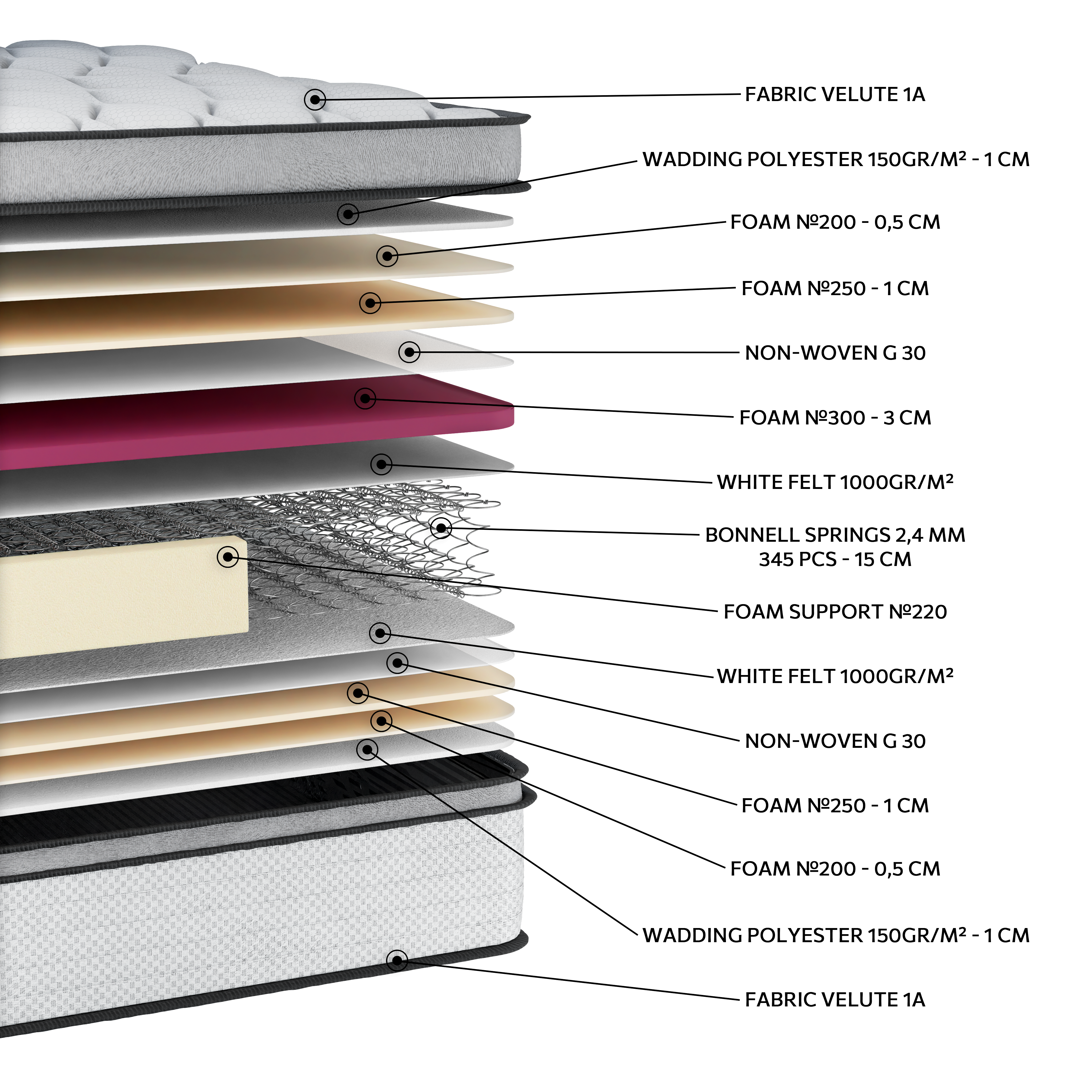 Σκληρό στρώμα με Pillowtop, σχεδιασμένο για απόλυτη στήριξη και αυξημένη αντοχή στον χρόνο. Ο συνδυασμός Bonnell Springs και ενισχυμένων στρώσεων αφρού εξασφαλίζει σταθερότητα και ομοιόμορφη κατανομή βάρους, ενώ το Pillowtop προσθέτει μια επιπλέον αίσθηση άνεσης. Το ύφασμα Velute 1A χαρίζει απαλή υφή και βελτιώνει τον αερισμό του στρώματος, δημιουργώντας ιδανικές συνθήκες για υγιεινό ύπνο. Μια εξαιρετική επιλογή για όσους αναζητούν στιβαρή στήριξη με μια διακριτική αίσθηση πολυτέλειας.